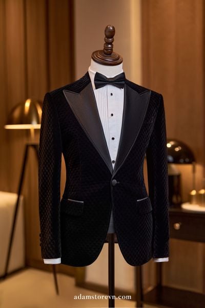 Vest nhung đen ô trám cổ ve nhọn 1 hàng khuy The Tuxedo - TXVN25